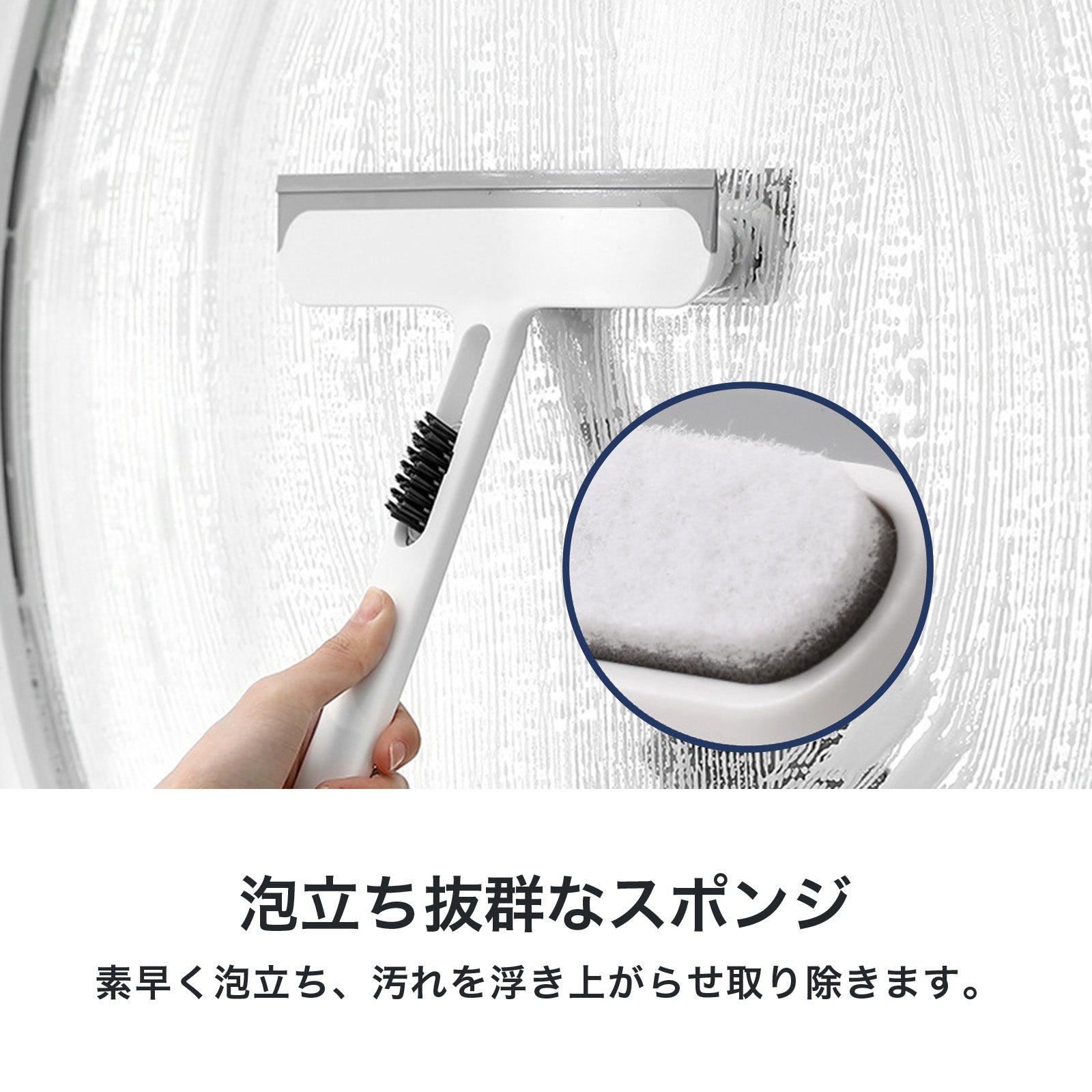 スクレーパー+スポンジ+ブラシ+隙間用ミニブラシのWヘッド構造。ガラス・鏡・窓・浴室・タイルの汚れをこれ1本で対応。