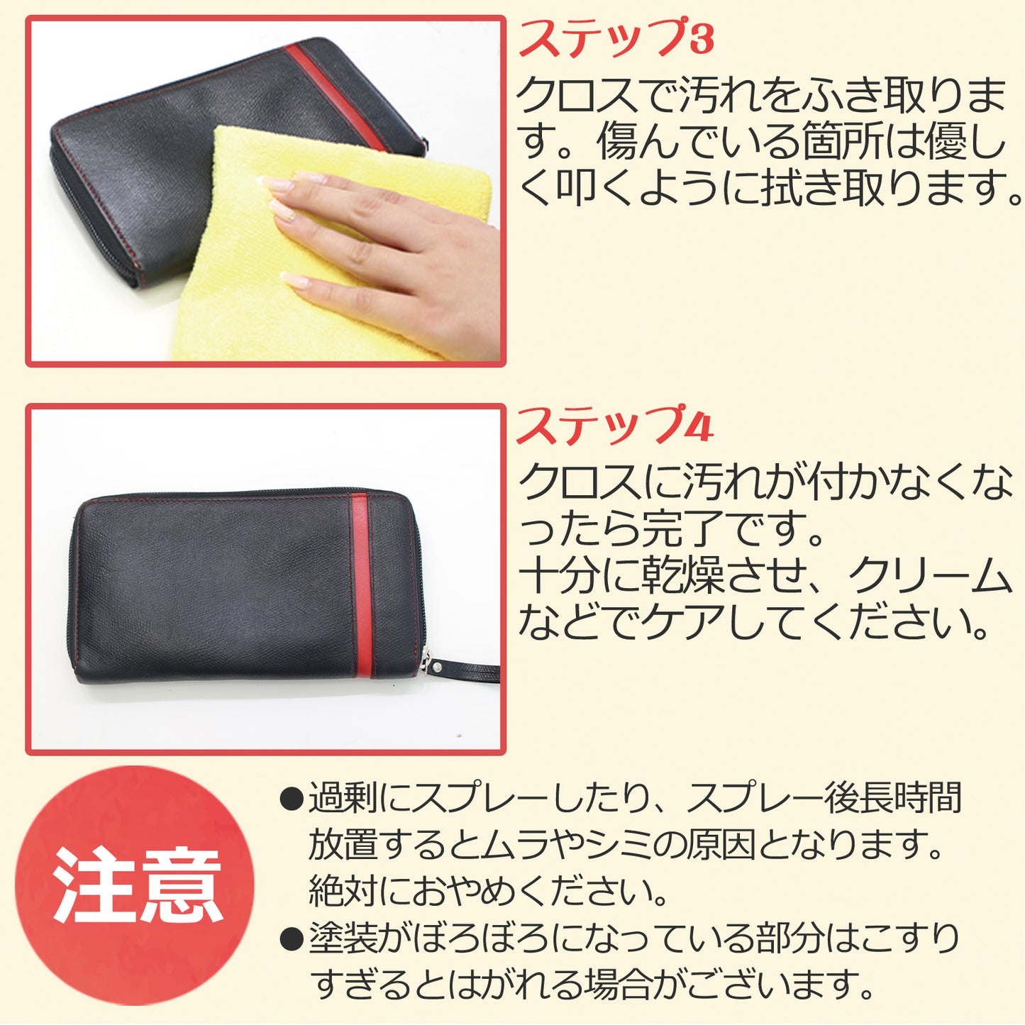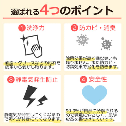 除菌・防カビ・消臭成分を配合しており、クリーニング後も清潔感と快適さを長時間キープ。革の質感を損なうことなく、本来のサラサラとしたマットな風合いに仕上げます。