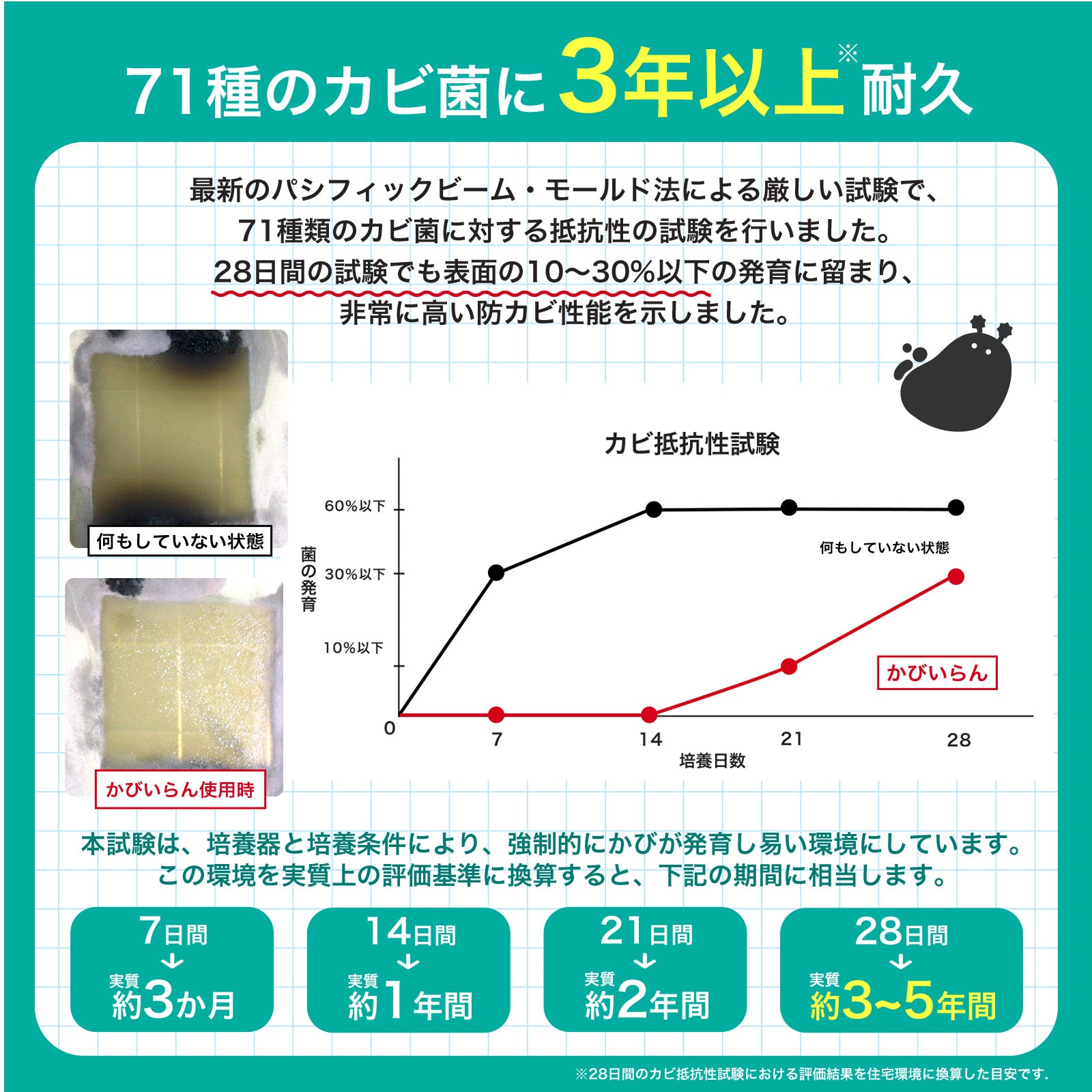 第三者機関による防カビ試験では、71種類のカビ菌に対して28日間の抵抗性を確認。