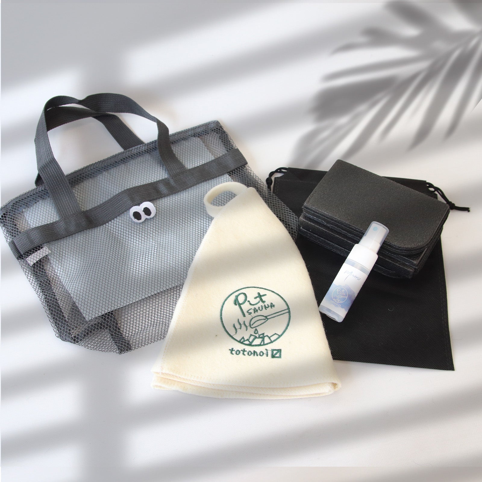 サウナハット・マット・消臭スプレー・通気性バッグ・小物入れ付き。